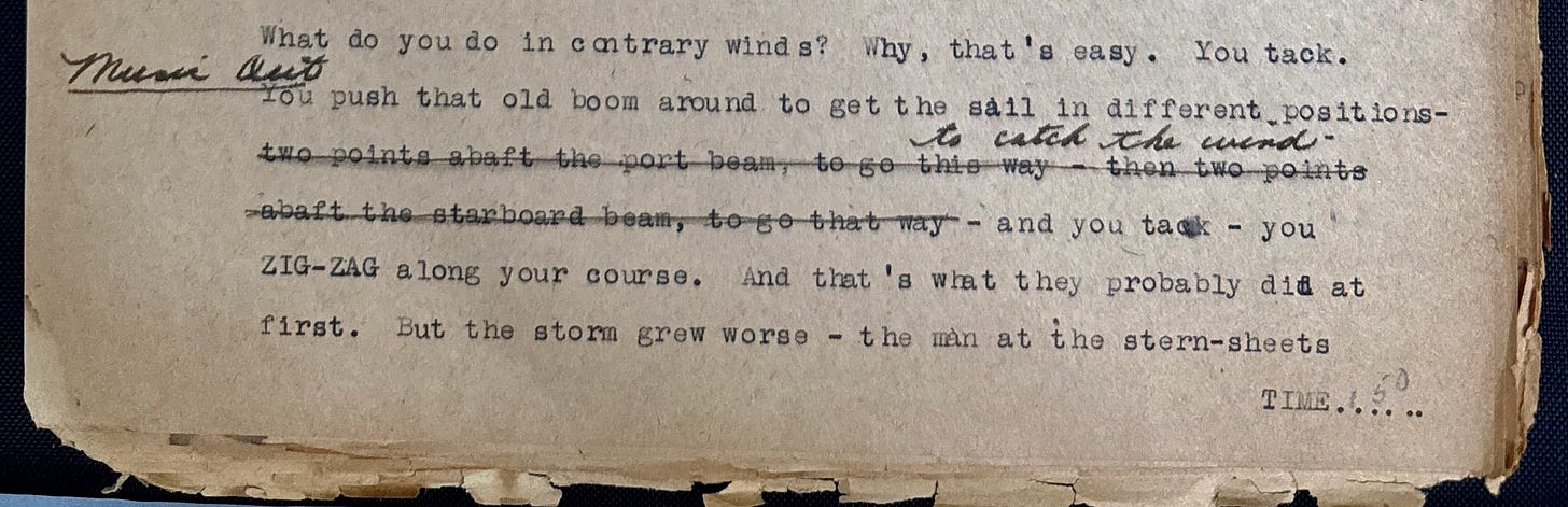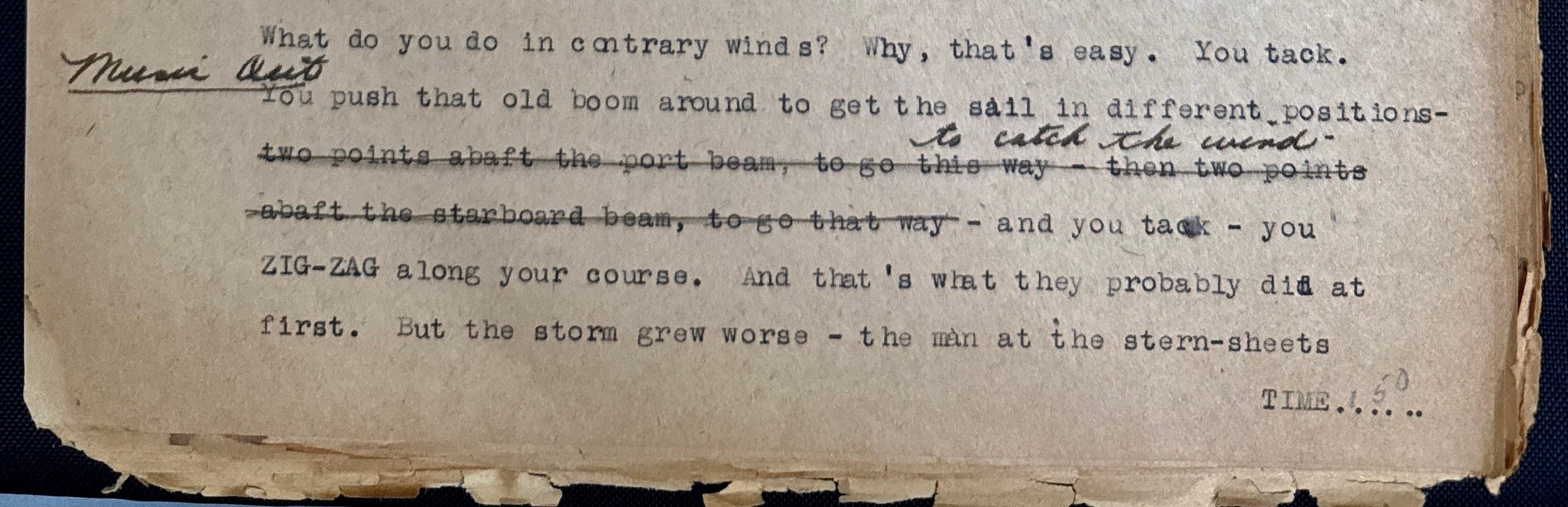 What do you do in contrary winds? Why, that’s easy. You tack. You push that old boom around to get the sail in different positions—two points abaft the port beam, to go this way—then two points abaft the starboard beam, to go that way—to catch the wind—and you tack—you ZIG-ZAG along your course. And that’s what they probably did at first.
