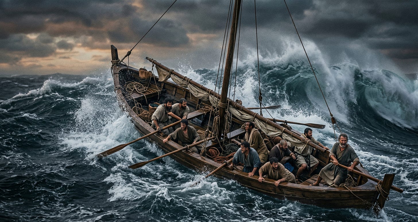 “Break out the oars! Look alive on that tiller—keep her headed into the waves! Don’t let her head slide off into the trough! If one of those waves catches her broadside, we haven’t got a chance!”