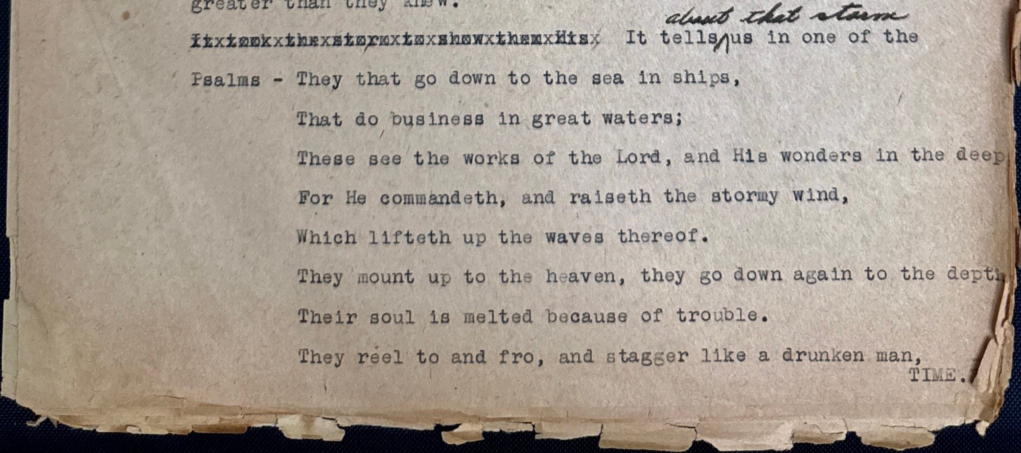 They that go down to the sea in ships, That do business in great waters; These see the works of the Lord, and His wonders in the deep. For He commandeth, and raiseth the stormy wind, Which lifteth up the waves thereof. They mount up to the heaven, they go down again to the depths. Their soul is melted because of trouble. They reel to and fro, and stagger like a drunken man, And are at their wit’s end. Then they cry unto the Lord in their trouble, And He bringeth them out of their distresses. He maketh the storm a calm, so that the waves thereof are still. Then are they glad because they be quiet; So He bringeth them unto their desired haven. Oh that men would praise the Lord for His goodness, And for His wonderful works to the children of men!2