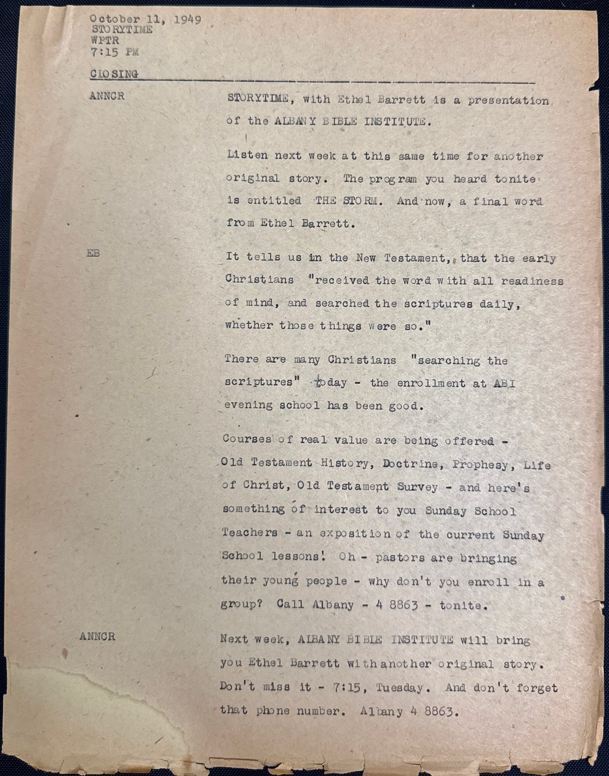 ANNCR: Next week, ALBANY BIBLE INSTITUTE will bring you Ethel Barrett with another original story. Don’t miss it—7:15, Tuesday. And don’t forget that phone number. Albany 4-8863.