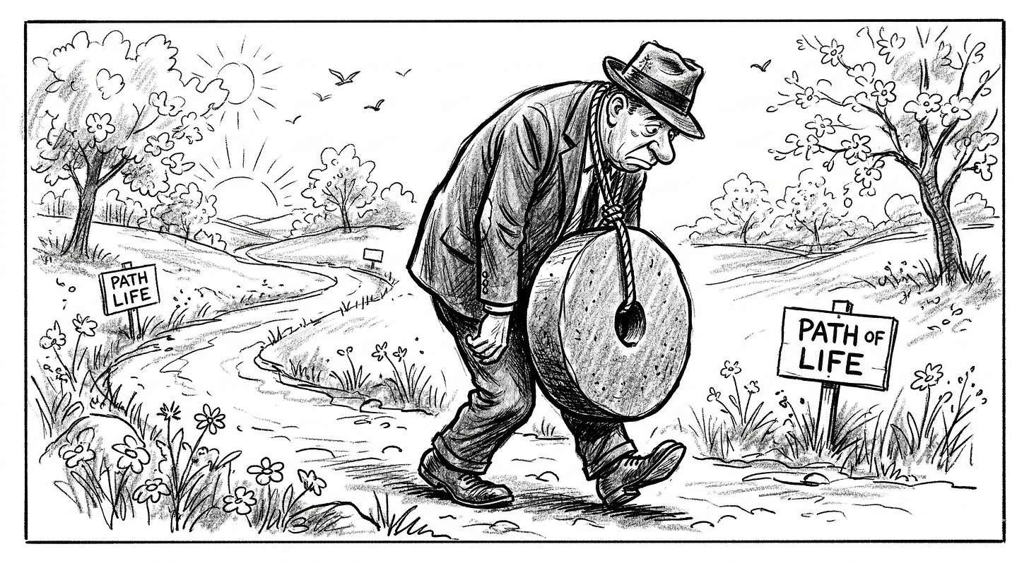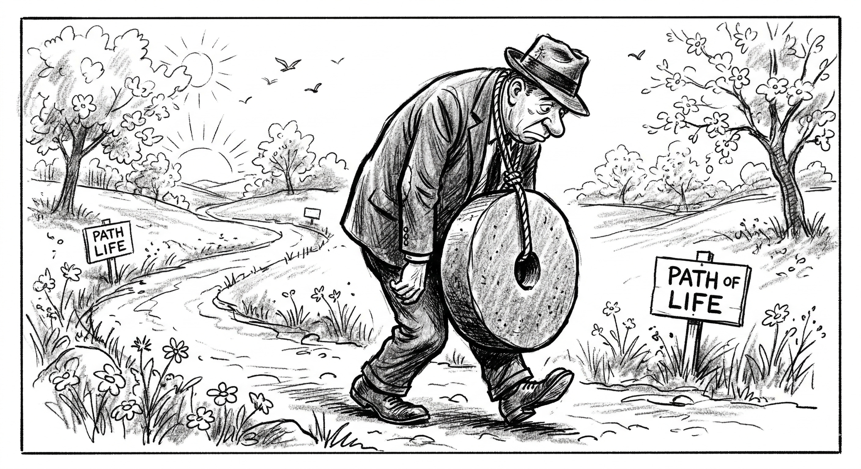 Some of them tied their troubles all up again, and with a long string, they put them around their necks and hung them in front of. Millstones. / So when they walked along, their heads were bowed and their eyes were down, and they couldn’t see the beautiful things of life at all.