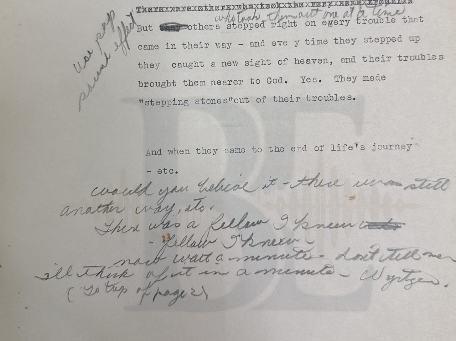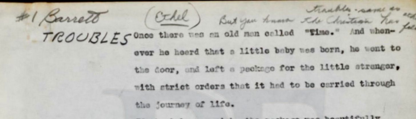 This manuscript, filed in Ethel’s archive as “Time,” but bearing a hand-written title of ‘Troubles,” is a classic example of Ethel’s ability to integrate and adapt timeless spiritual allegories for a modern audience. The bag of troubles beckons to Bunyan’s Pilgrim’s Progress’s burden of sin, while the 'Stepping Stones' motif has roots in 19th-century homiletics, Ethel has completely reimagined the narrative—introducing the character of 'Experience' and anchoring the truth in the contemporary life of evangelist Jack Wyrtzen.1