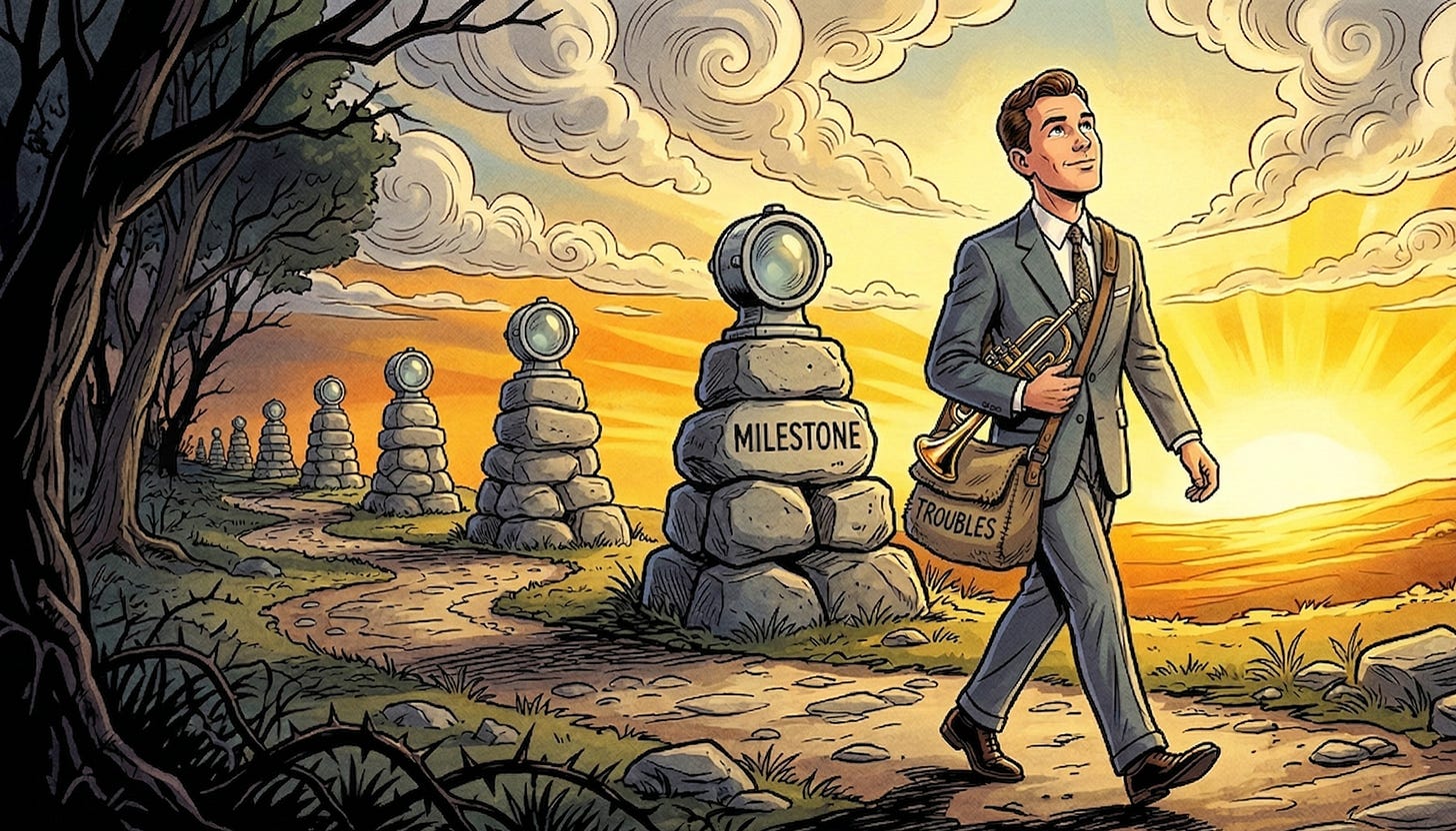 And when he looked back on the road he had come along he could see all that he had passed by, that he would never have to pass again—and it made his troubles beautiful MILESTONES.