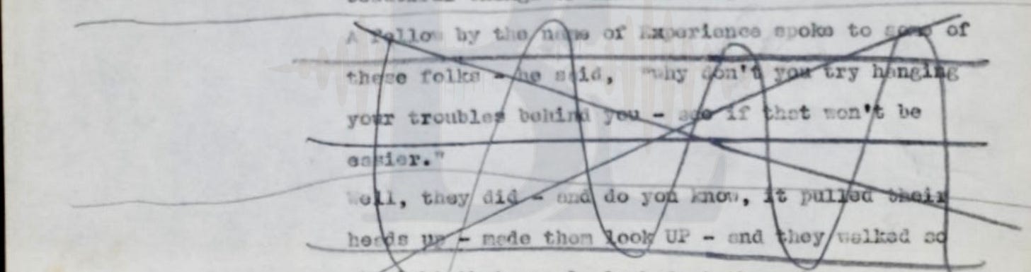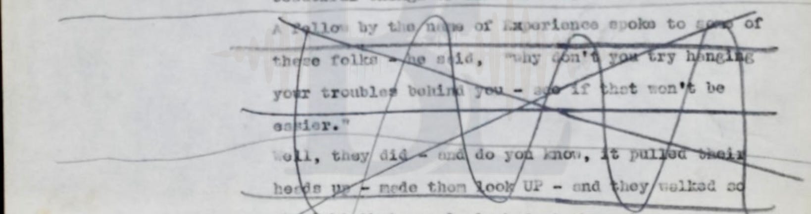 In the original manuscript, Ethel had lined out the section regarding 'Experience' suggesting we hang our troubles behind us. While she may have cut this for time during a live broadcast, I have restored it here. Without this bridge, the transition from 'bowed heads' to 'walking straight' loses its narrative logic. It is a rare glimpse into her editing process—balancing the clarity of the story against the time constraints of a “live” performance.